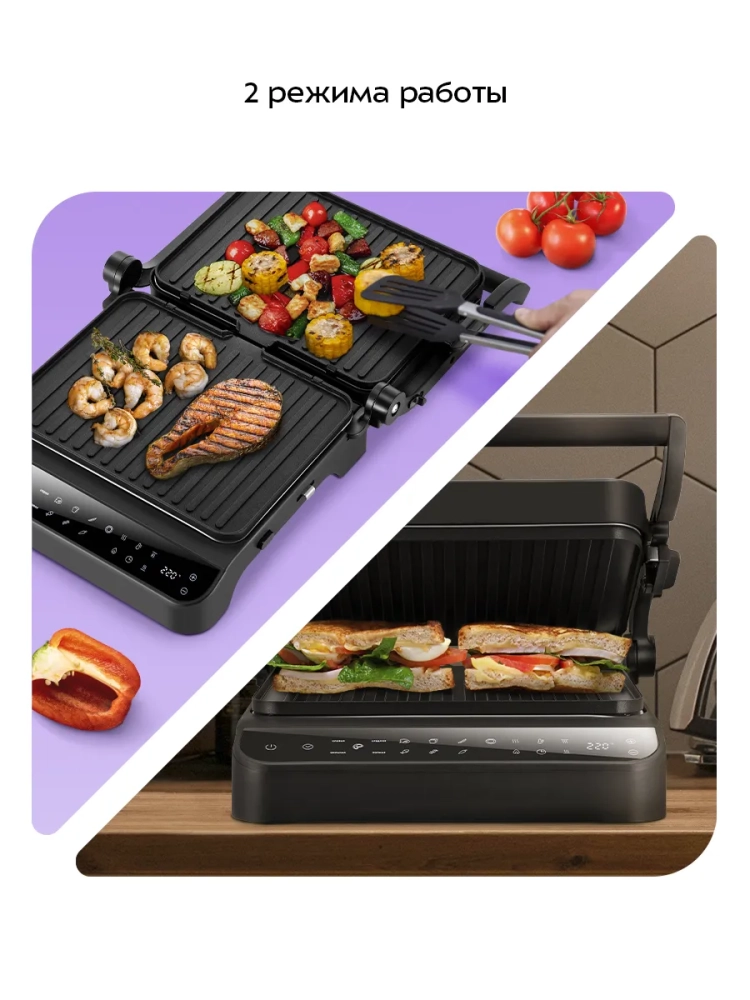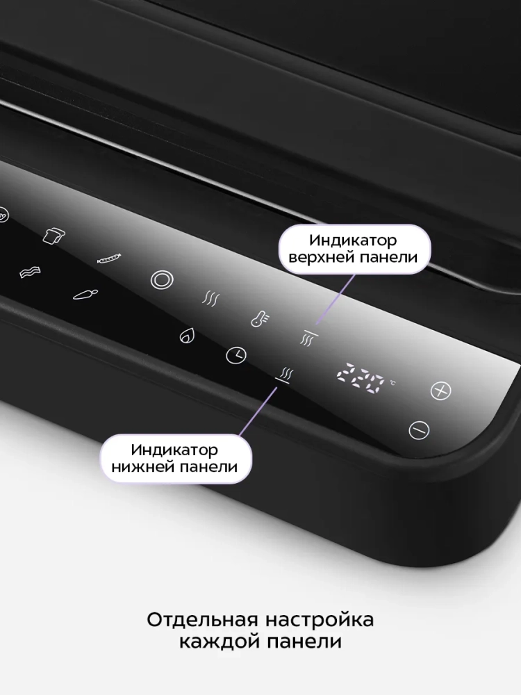 Электрогриль оснащен термостатом для поддержания постоянной температуры нагреваемых панелей, а также панелью управления. Вы можете выбрать нагреваемую панель и настроить нужную температуру и время таймера. Температура нагрева каждой панели настраивается отдельно, поэтому есть возможность настроить разную температуру нагрева панелей или включить нагрев только нижней или верхней панели. На дисплее отображаются температура и время таймера.