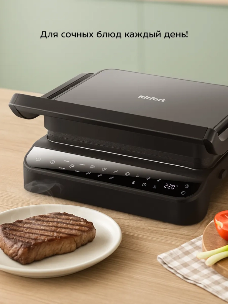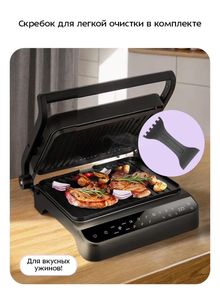Также у гриля предусмотрено 6 автоматических режимов и 4 степени прожарки стейка с предустановленными настройками температуры и времени.