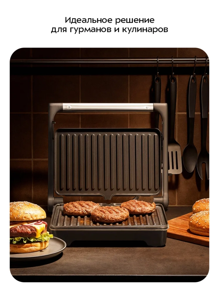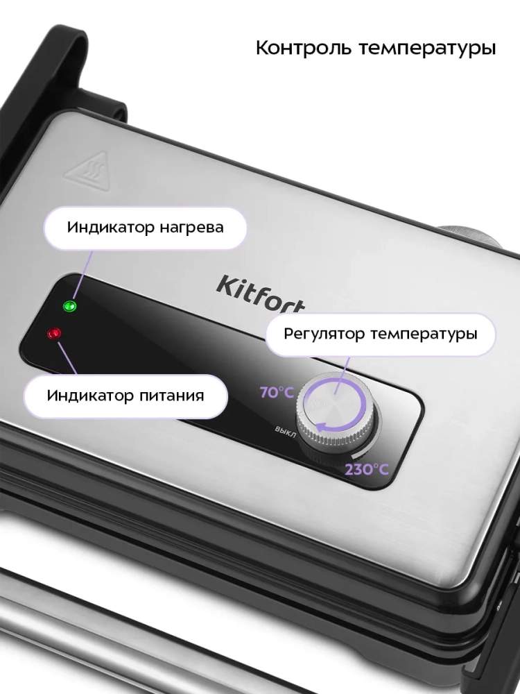 Гриль оснащен термостатом для поддержания температуры панелей, а также индикаторами питания и нагрева. С помощью регулятора температуры вы сможете плавно менять температуру приготовления.