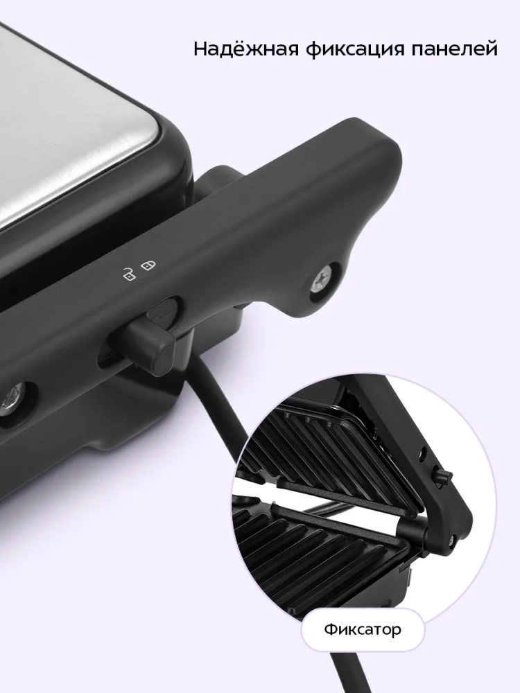 Специальные фиксаторы сбоку гриля позволяют фиксировать крышку в закрытом состоянии, а также поддерживают крышку гриля при приготовлении в одностороннем режиме.