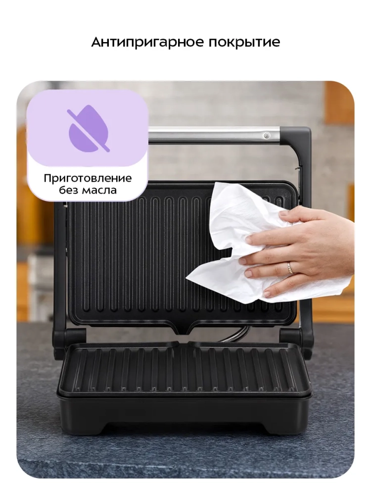 На панели нанесено антипригарное покрытие, что позволяет готовить с минимальным количеством масла. Такое покрытие также облегчает процесс чистки панелей.