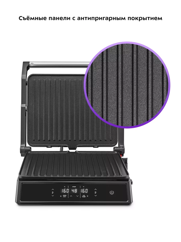 На панели нанесено антипригарное покрытие, что позволяет готовить с минимальным количеством масла или без него. Такое покрытие также облегчает процесс чистки панелей. Панели у этого гриля съемные.