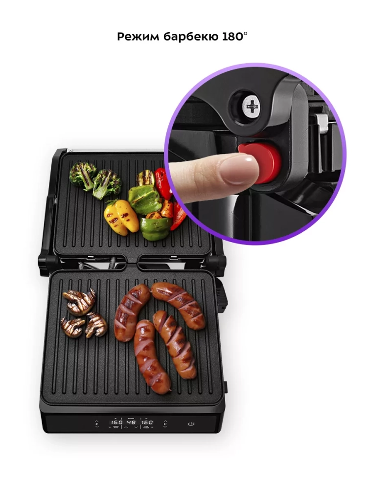 Конструкция гриля позволяет готовить в трех режимах: двустороннем, одностороннем и с приоткрытой крышкой. В двустороннем режиме гриль закрывается крышкой, благодаря чему продукты находятся между двух нагреваемых панелей и готовятся с двух сторон. В режиме приготовления с приоткрытой крышкой верхняя нагреваемая панель опускается не до конца, что полезно при готовке продуктов, которые могут потерять форму из-за давления крышки. В одностороннем режиме крышка гриля откидывается на 180°, благодаря чему гриль превращается в большую жаровню, а продукты можно выложить сразу на две панели. Данная модель оснащена поддоном для слива жира и сока, которые выделяются в процессе приготовления продуктов.