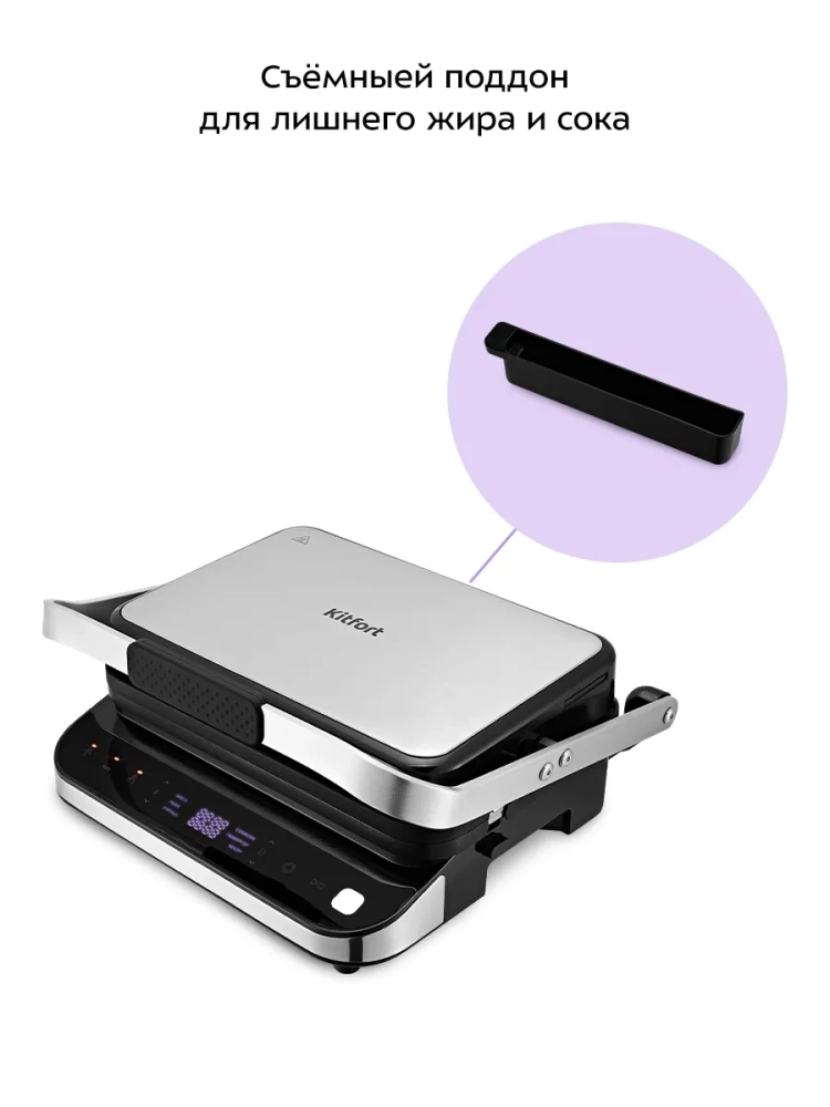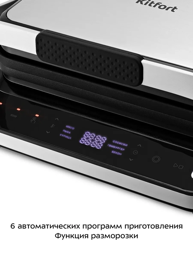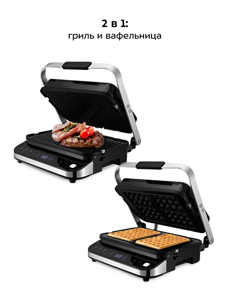 Электрогриль Kitfort КТ-1682 — это многофункциональный прибор, который станет незаменимым помощником на вашей кухне. Этот электрический гриль позволяет готовить разнообразные блюда: мясо, рыбу, овощи и даже бутерброды. Благодаря высокой температуре и ребристой поверхности панелей продукты приобретают аппетитный полосатый рисунок. Конструкция электрогриля предусматривает два режима работы: двусторонний и односторонний. В двустороннем режиме крышка закрывается, обеспечивая равномерное приготовление с двух сторон без необходимости переворачивания продуктов. В одностороннем режиме крышка откидывается на 180°, превращая гриль в большую жаровню с возможностью использования обеих панелей одновременно. Панели изготовлены из алюминия с антипригарным покрытием, что позволяет использовать минимум масла и облегчает чистку после приготовления. Электрогриль оснащен термостатом для поддержания постоянной температуры и панелью управления для выбора режимов работы устройства. Съемный поддон предназначен для сбора жира и соков во время готовки, что делает процесс более удобным и гигиеничным. В комплект входят дополнительные панели для приготовления бельгийских вафель — идеальное решение для любителей сладкого. Этот бытовой прибор от Kitfort отличается не только функциональностью, но также стильным дизайном и надежностью в эксплуатации. Грильница подходит как для домашнего использования на кухне, так и для барбекю на открытом воздухе благодаря своей универсальности. Электро техника Kitfort КТ-1682 — это ваш шанс насладиться вкусной едой каждый день! Готовьте блюда быстро благодаря этому кухонному устройству.