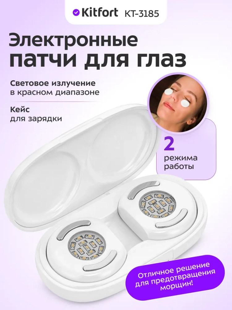 Электронные патчи для глаз Kitfort KT-3185 способствуют тонизированию кожи вокруг глаз и замедлению появления морщин, помогают избавиться от отеков и темных кругов под глазами. Использование прибора способствует повышению эластичности кожи и увеличивает эффективность от применения питательных косметических средств.