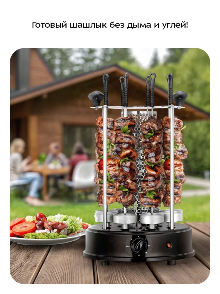 Прибор прост и удобен в использовании. Он работает от обычной электрической розетки, не нужно ставить мангал и разжигать угли, нет никакой сажи, дыма и копоти. Нужно лишь нанизать замаринованное мясо на шампуры и установить их в устройство.