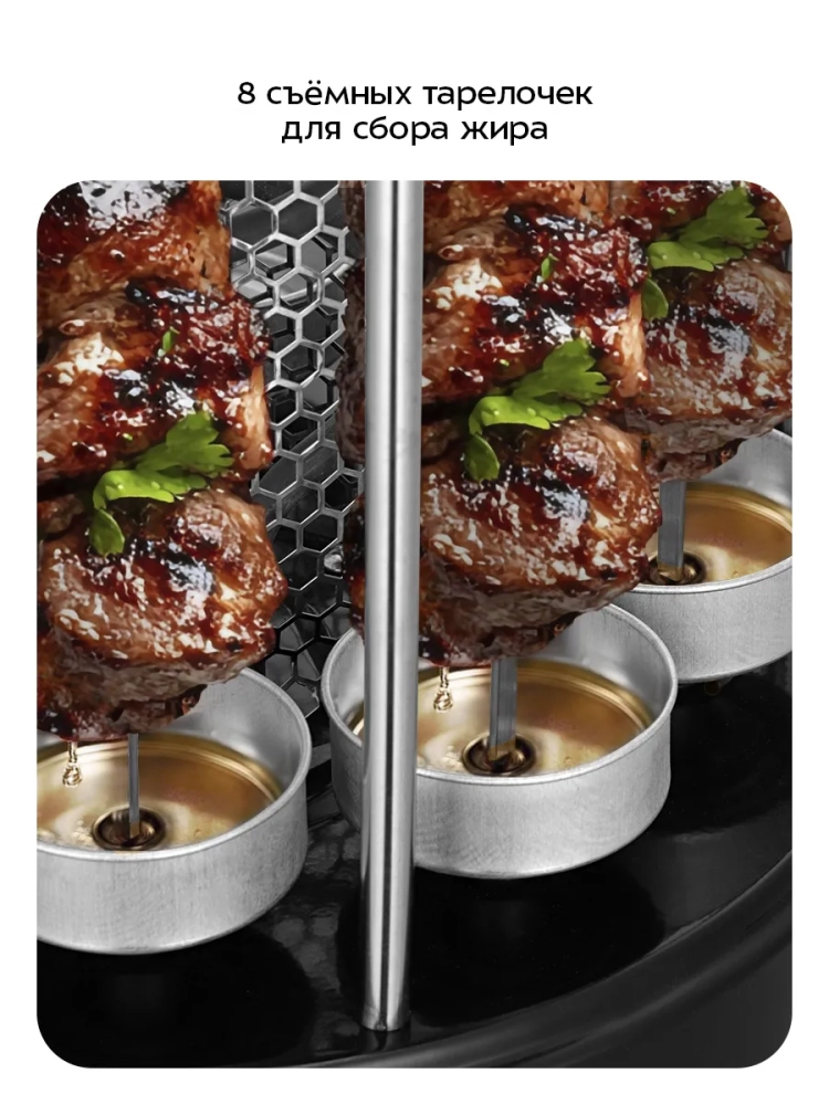 Благодаря вертикальной конструкции электрошашлычница очень компактна и не занимает много места. Под каждым шампуром расположена специальная емкость, куда стекают сок и жир. Кожух шашлычницы с ручками легко снимать и устанавливать.