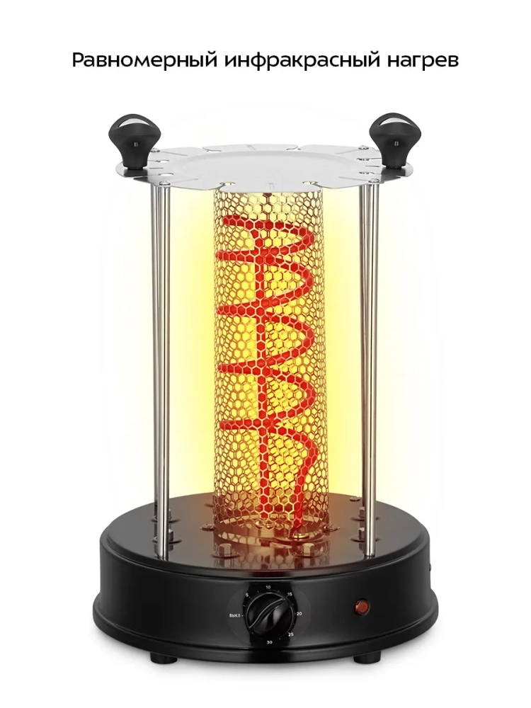 Шампуры автоматически вращаются, поэтому во время приготовления происходит чередование процесса нагрева и охлаждения, благодаря чему мясо приобретает нежный вкус и равномерно обжаривается со всех сторон. Электрошашлычница оснащена таймером до 30 минут.
