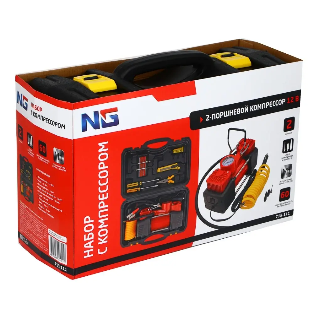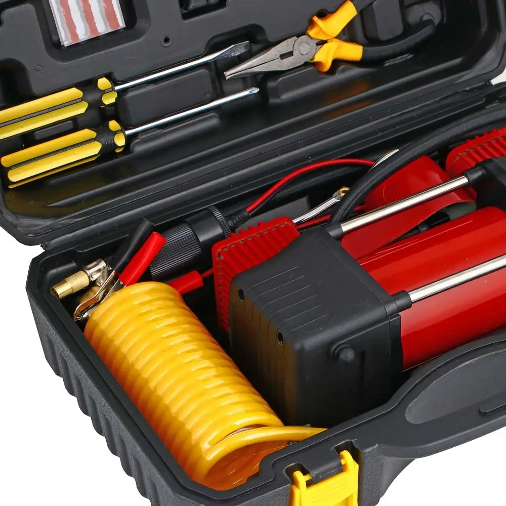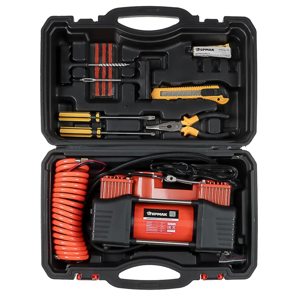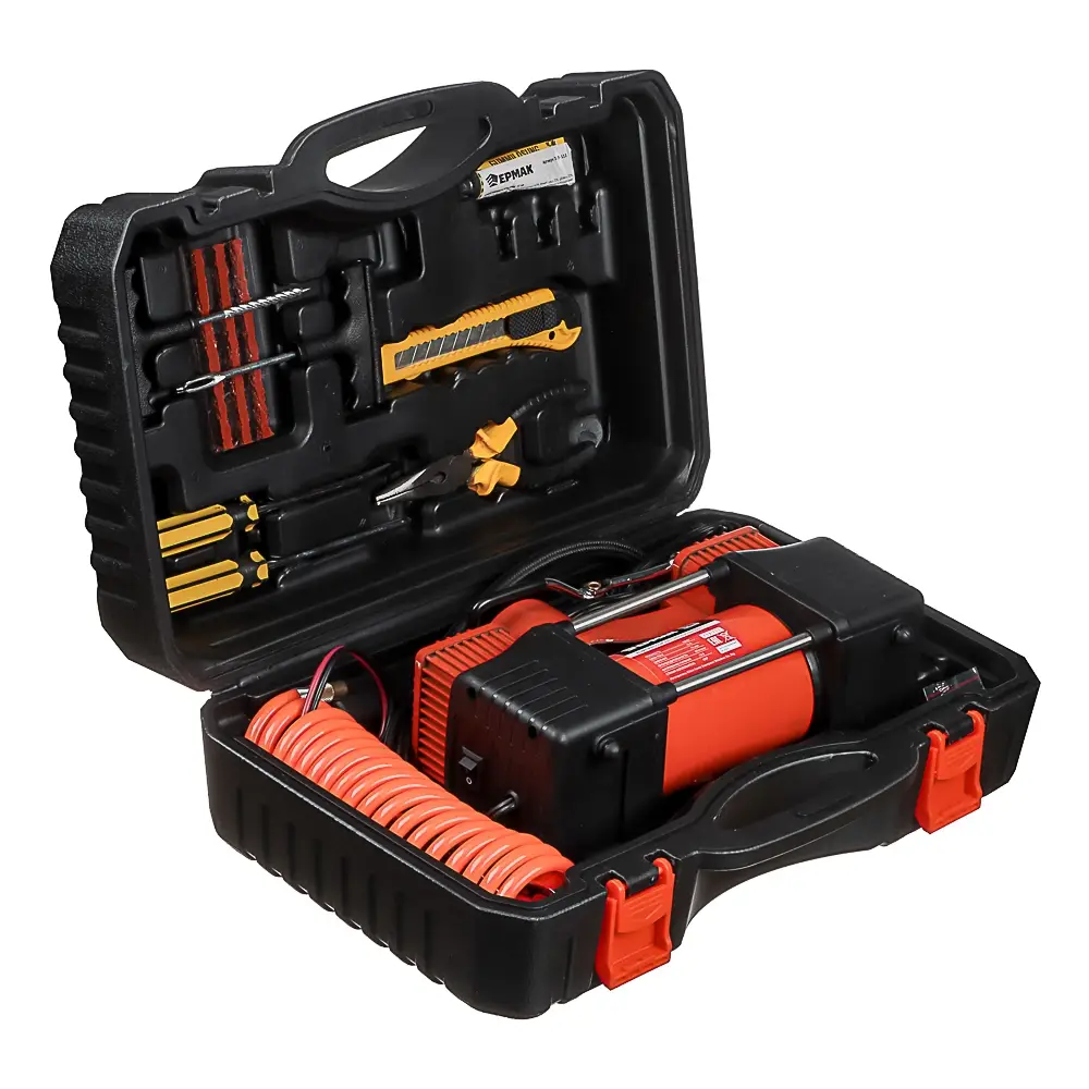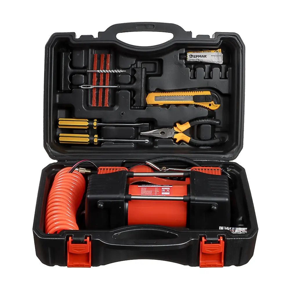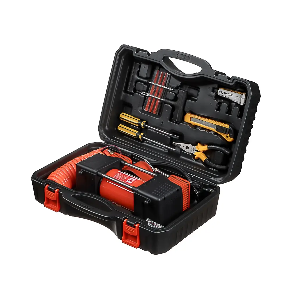 Набор из 12-ти предметов с 2-х поршневым компрессором 12В, 180 Вт включает необходимый набор инструментов для автомобилиста для осуществления мелкого ремонта в дороге, а также компрессор для накачки шин производительностью 60 л/мин, что позволяет быстро и эффективно подкачать спущенную покрышку. Прочный металлический корпус с пластиковыми элементами делает устройство надежным и долговечным. Комплект также включает набор переходников, отвертки, клей, тонкогубцы, жгуты, строительный нож и другие предметы, которые находятся в удобном пластиковом кейсе.