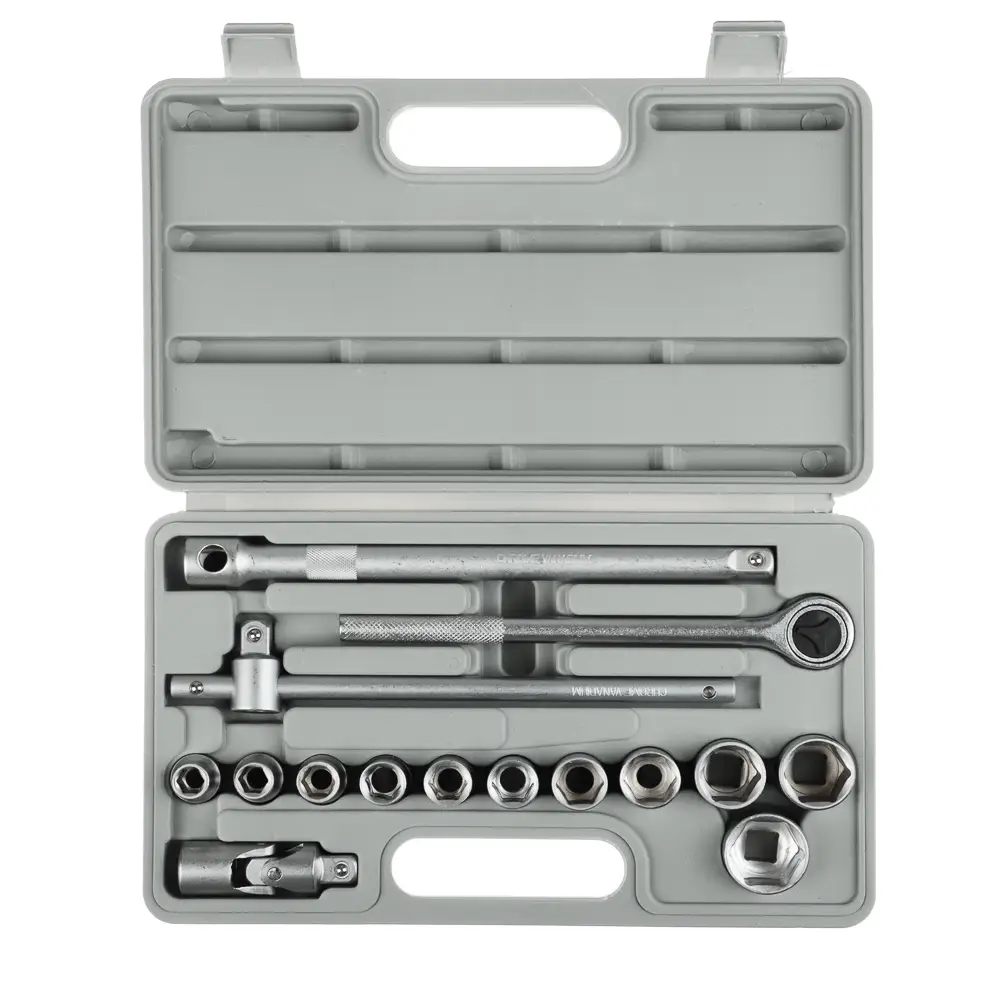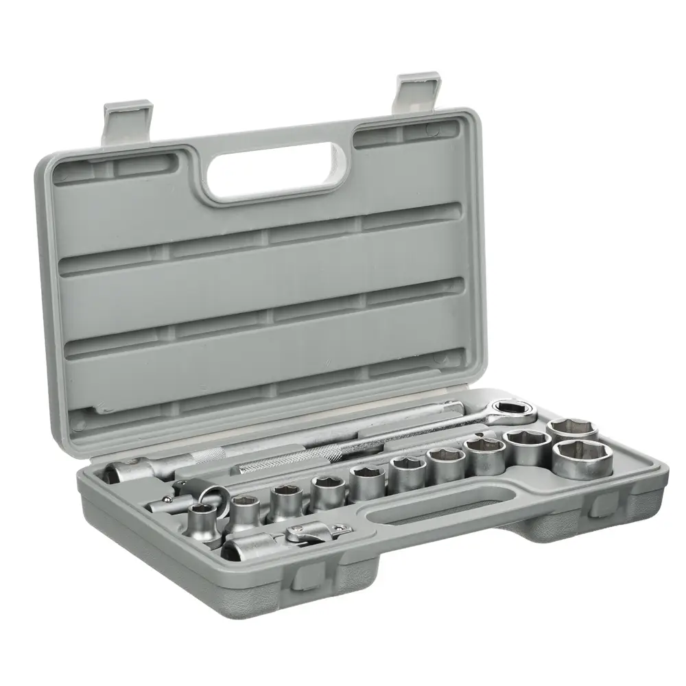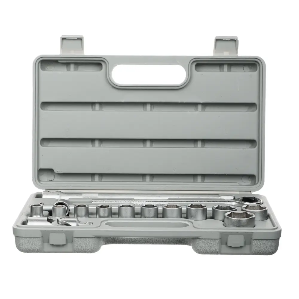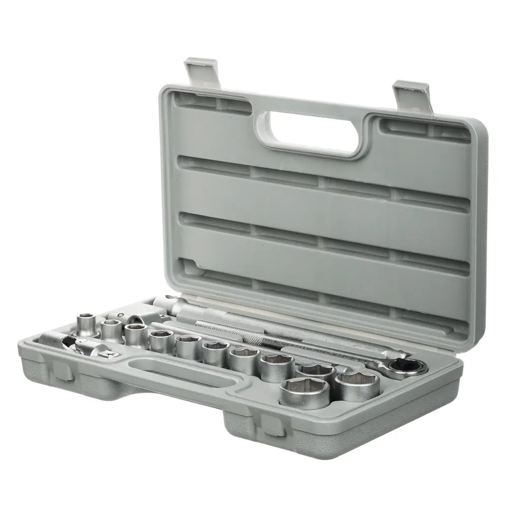 - Ключ трещоточный 1/2"; Шарнир карданный 1/2"; Головки торцевые 1/2" — 11 шт.: 10, 11, 12, 13, 14, 15, 17, 19, 22, 24, 27; Удлинитель 1/2"200 мм; Кейс; Вороток Т-образный 1/2"