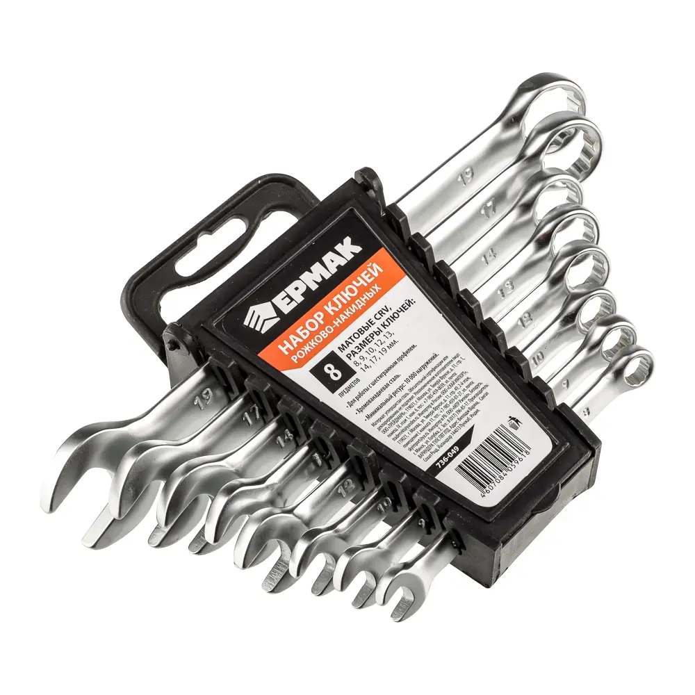 ЕРМАК Набор ключей рожково-накидных, 8 предм. 8-19мм, матовые CRV, пластик холдер