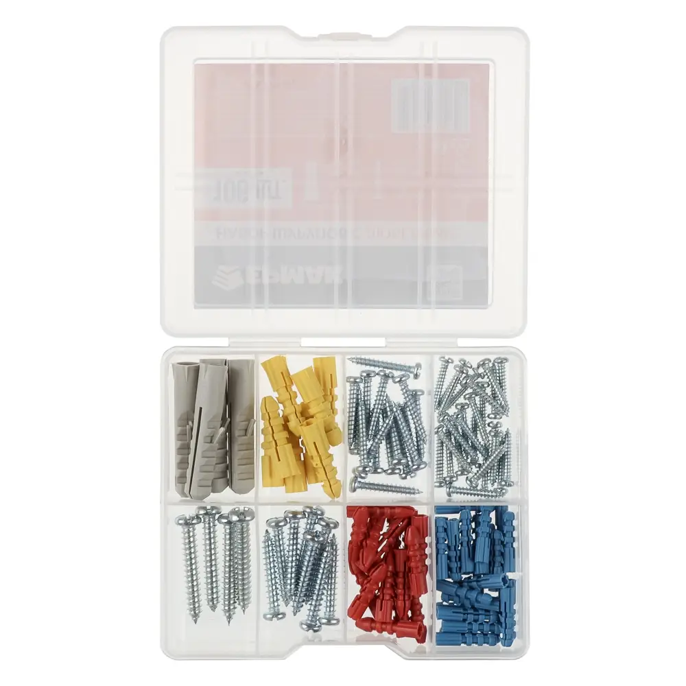 Набор крепежных элементов ЕРМАК — это готовое решение для монтажных работ любой сложности. В комплекте собраны самые востребованные размеры шурупов и дюбелей, что позволяет подобрать оптимальный вариант для каждого типа материала и задачи. В набор входят четыре типоразмера дюбелей и соответствующие им шурупы из углеродистой стали. Все элементы упакованы в удобный пластиковый органайзер для хранения. Крепежные элементы отличаются точностью геометрии и устойчивостью к коррозии. Продуманная компоновка набора экономит время на поиск деталей и обеспечивает порядок в мастерской. Набор предназначен для монтажа в бетон, кирпич и другие плотные материалы.