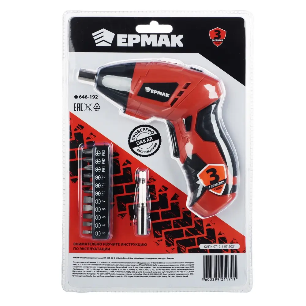 ЕРМАК Отвертка аккум. ОА-48C, 4,8 В, Ni-Cd, 0,6 Ач, 2 Нм,200 об/мин,LED подсветка. пов. рук,блистер