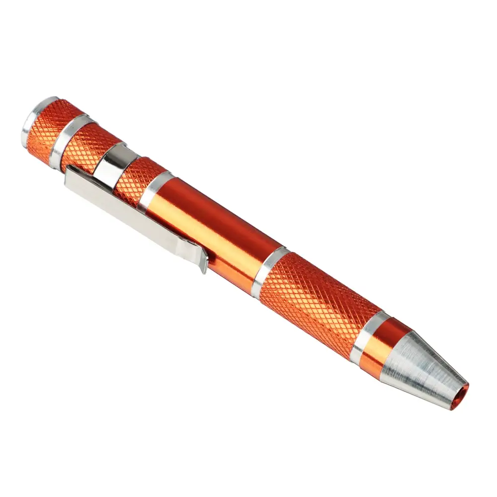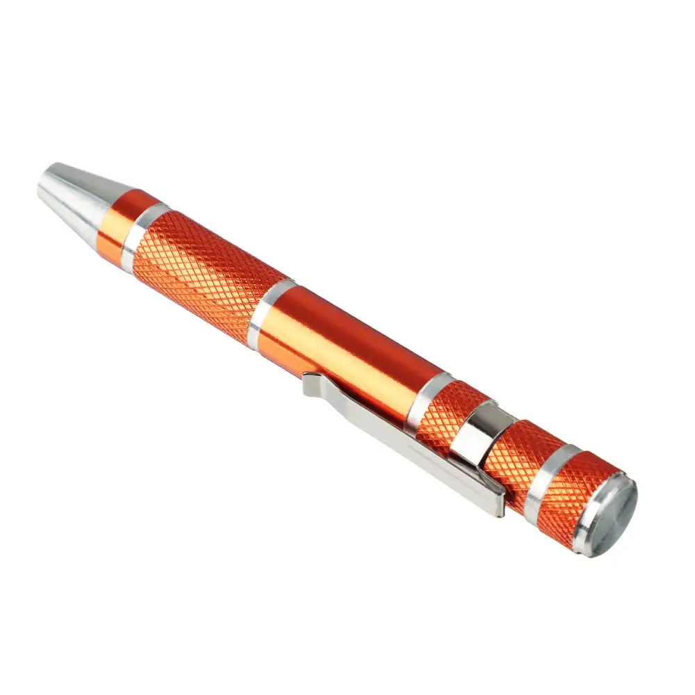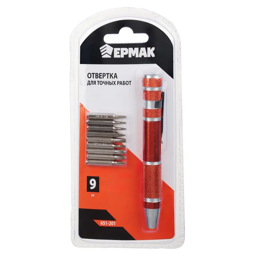 Отвертка для точных работ в форме ручки с битами ЕРМАК из углеродистой стали на вид напоминает обычную ручку для письма с удобной клипсой для крепления на одежде. Имеет компактный размер, поэтому ее удобно носить даже в кармане. Комплект также включает 9 бит популярных типов и размеров. Отлично справляется с резьбовыми соединениями, а биты имеют высокоточную подгонку, что помогает в процессе ремонта различных мелких точных механизмов. Материал отвертки и бит обладает высокой стойкостью к деформации.