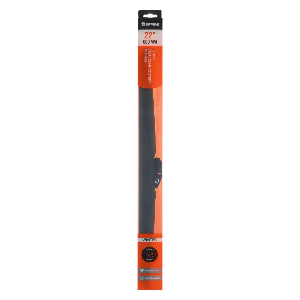 Щетка стеклоочистителя зимняя ЕРМАК, длиной 55 см/ 22", обеспечивает надежную работу в условиях снега и мороза. В основе конструкции лежит усиленный каркас, «упакованный» в резиновый чехол. Этот чехол предотвращает образование льда и наледи на элементах каркаса, тем самых сохраняя оптимальную прижимную силу и подвижность. Чистящий элемент зимних щеток значительно отличается от других типов стеклоочистителей, как формой профиля, так и составом. Чистящий элемент сохраняет эластичность даже в экстремальные морозы, что обеспечивает правильное скольжение по стеклу.