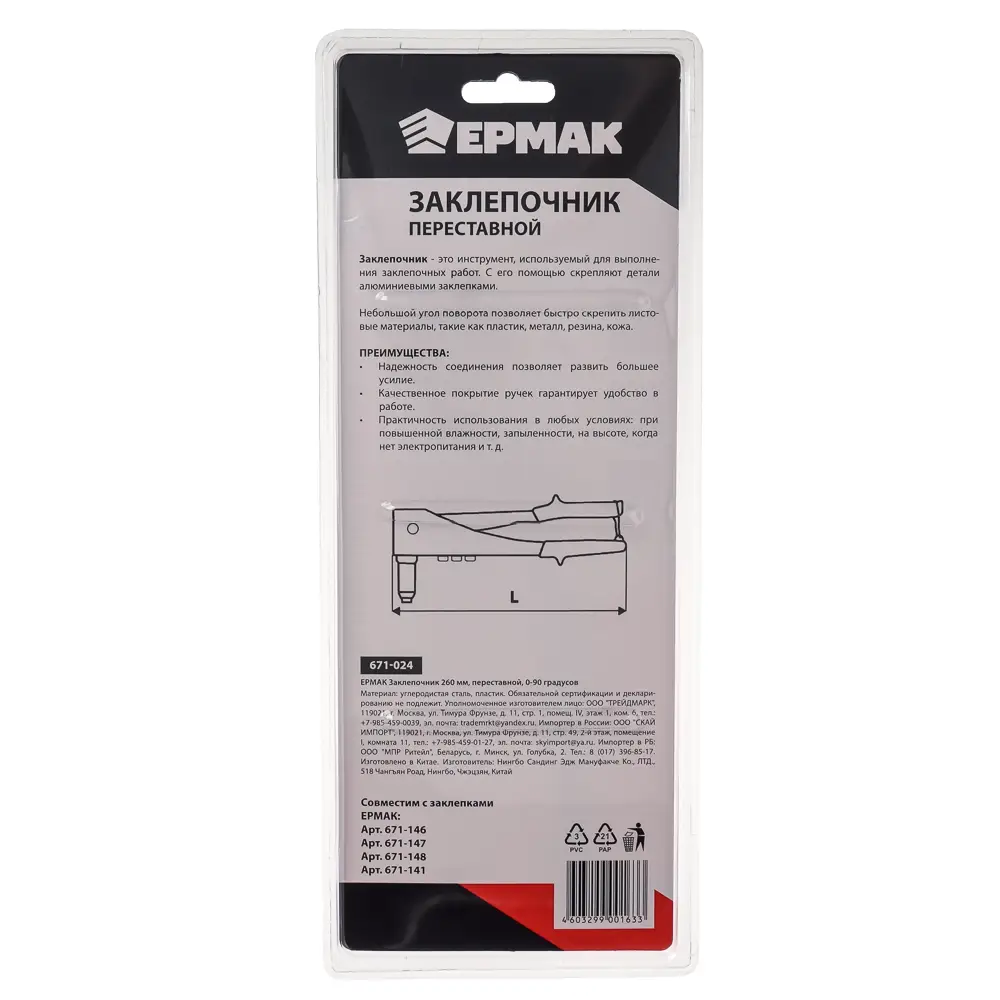 ЕРМАК Заклепочник 260мм переставной 0-90градусов