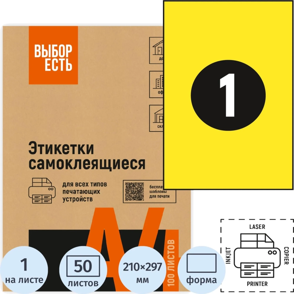 Этикетки самоклеящиеся 210х297мм желтая 1шт/л А4 50л/уп