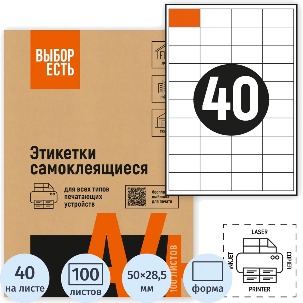 Этикетки самоклеящиеся 50х28,5мм, 40шт на лист А4,100л/уп