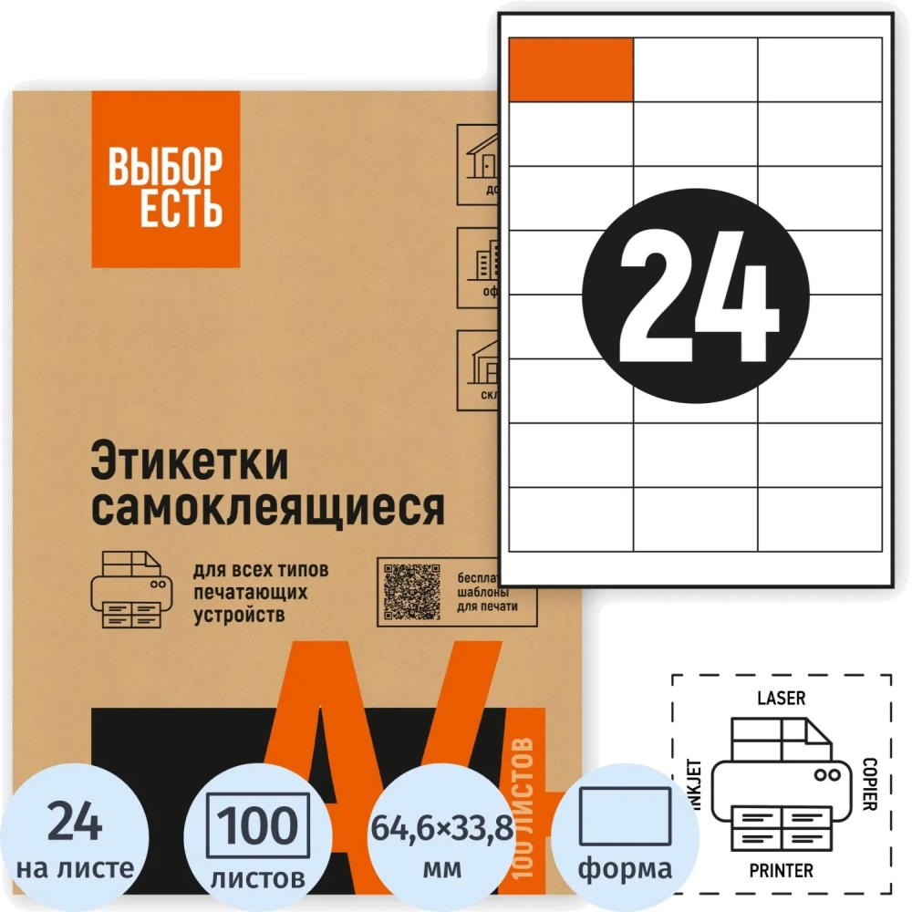 Этикетки самоклеящиеся 64,6х33,8мм, 24шт на лист А4,100л/уп
