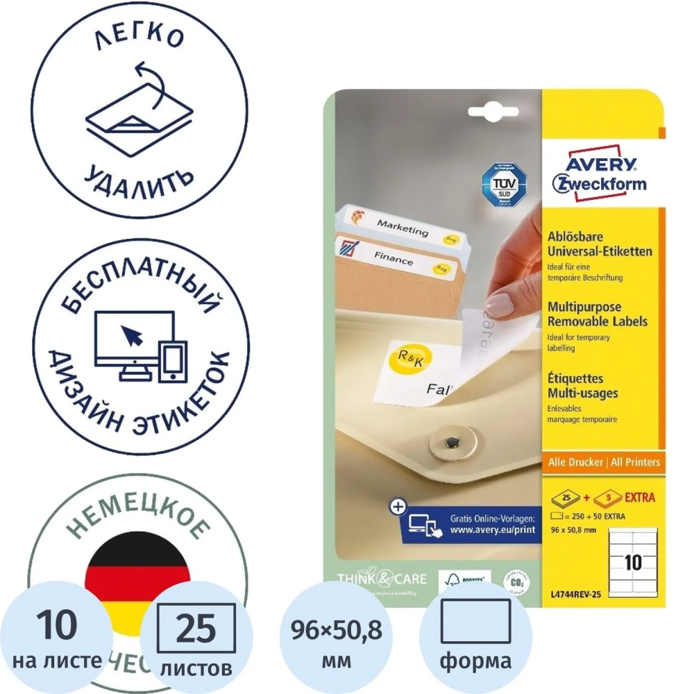 Этикетки самоклеящиеся L4744REV-25 удаляемые, 96х50,8мм, 10шт/л А4, 25л/уп