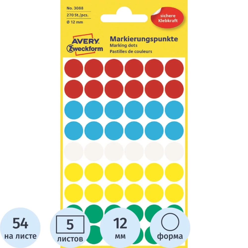 Этикетки самоклеящиеся точки 3088 d=12 мм, многоцветный, 270шт/уп