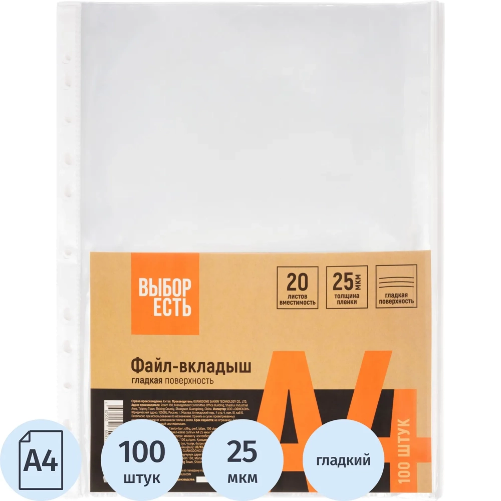 Файл-вкладыш А4 25 мкм, Выбор есть, гладкие, с перф, 100шт./уп