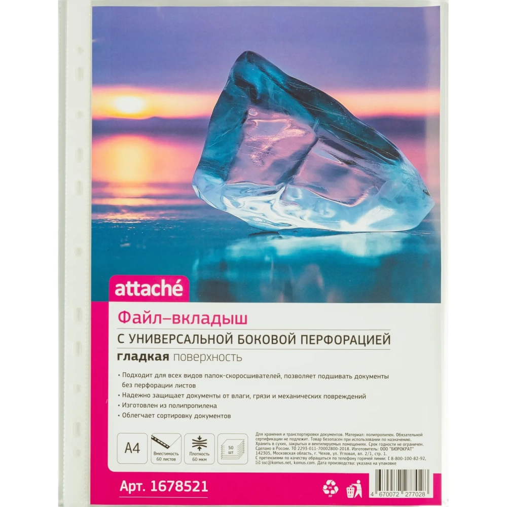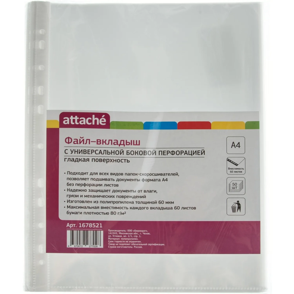 Файл-вкладыш А4, 60мкм, Attache, гладкий, 50шт/уп