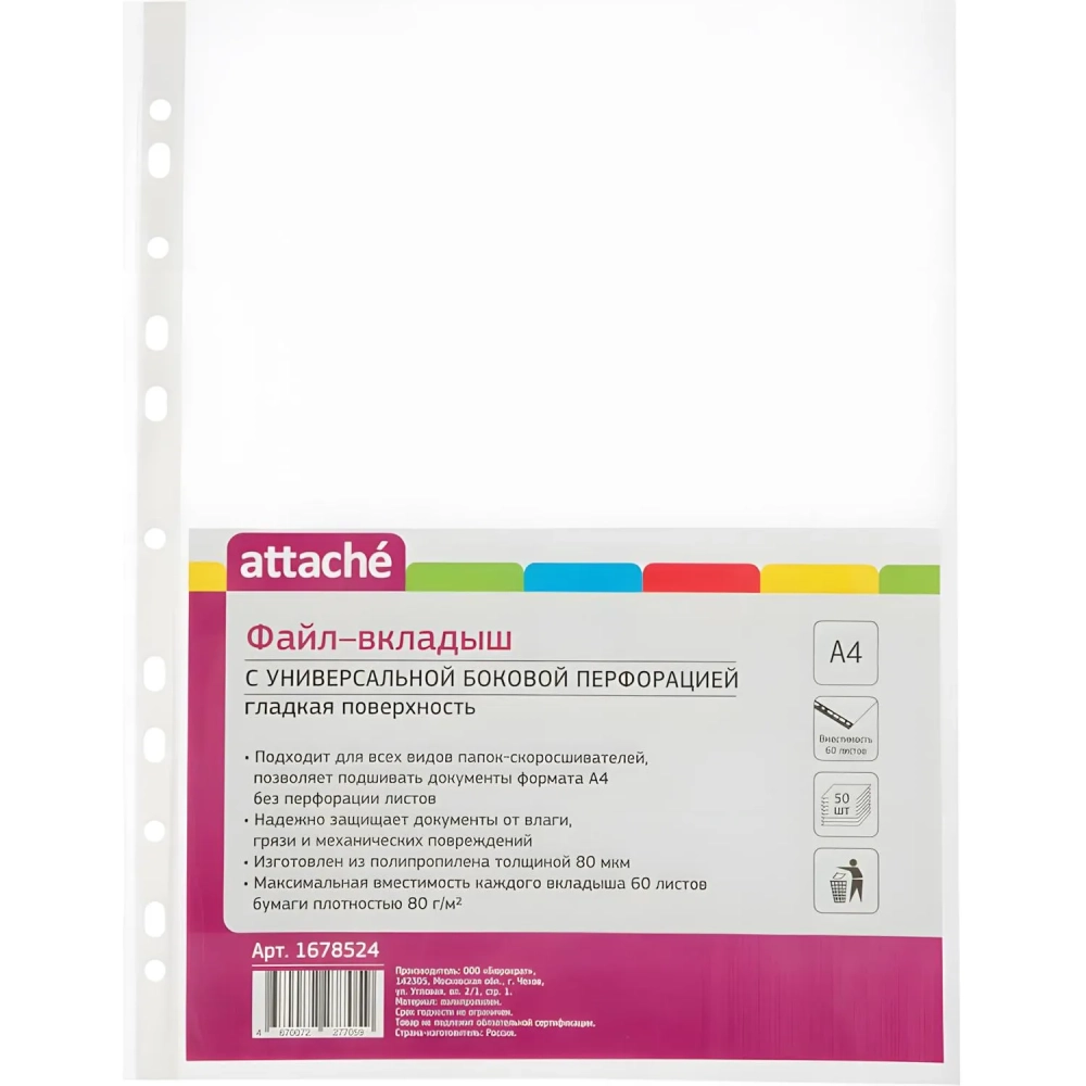 Файл-вкладыш А4, 80мкм, Attache, гладкий, 50шт/уп