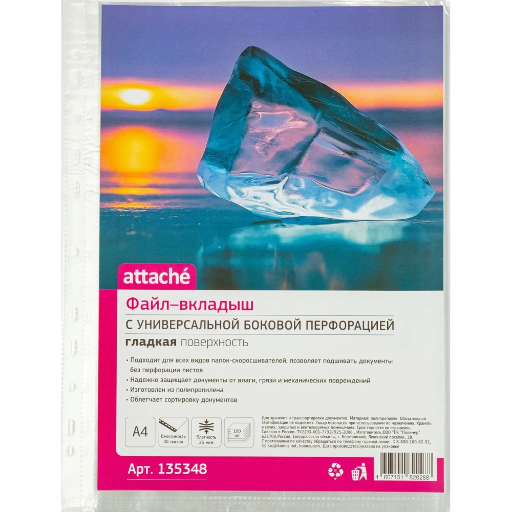 Файл-вкладыш А4 Attache,Стандарт ,25 мк м100шт./уп.с перф.Россия