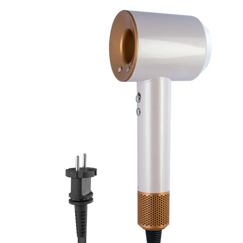 Набор фен Белый с золотом (5 в 1). Мощный профессиональный набор Supersonic Super Hair Dryer и 5 магнитных насадок предназначен для сушки и укладки волос. Данная модель стайлера имеет специальную технологию защиты волос от горячего воздуха, что позволит избежать повреждения волос и кожи головы. Фен для волос прекрасно подходит для ежедневного использования. Менять насадки очень просто благодаря магнитным основаниям, которые совершенно не нагреваются во время работы. Предусмотрено 4 температурных режима: для быстрого высушивания и укладки волос; для стандартного высушивания; для сушки при более низкой температуре и разделении; для высушивания холодным воздухом. Функция ионизации, диффузор для завивки и насадка выпрямления выпрямитель расческа. Максимальная мощность - 1350 Вт. Трехуровневая регулировка температуры ( 60/80/100 градусов ) и скорости. Есть функция 'Холодный обдув' ( Нажмите и удерживайте для отключения тепла ). Кнопка данной функции находится под переключателем ВКЛ/ВЫКЛ. Так же в данном товаре присутствует фильтрация воздуха для защиты вашего дыхания во время сушки. Рекомендуется периодически чистить фильтр от пыли ( находится в нижней части фена ). Длина сетевого шнура - 3 метра. Количество насадок - 4шт.