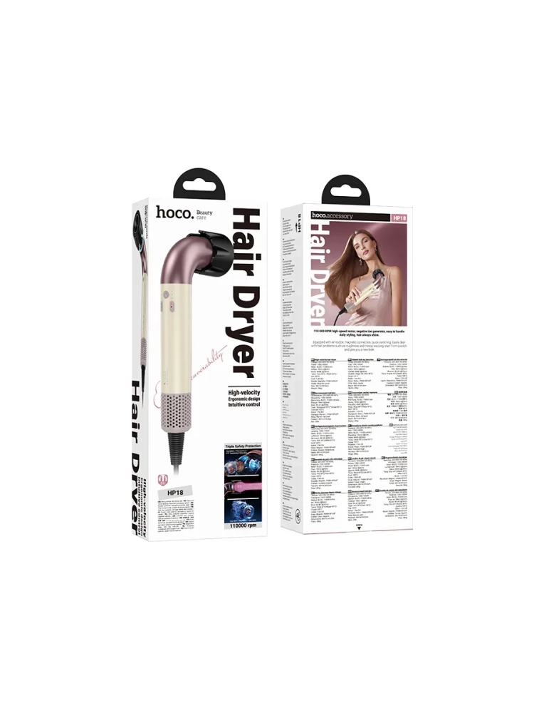 Особая форма корпуса HP18 обеспечивает удобное использование, а также исключает возможность случайного травмирования: устройство не затягивает волоски во время сушки и не повреждает их.