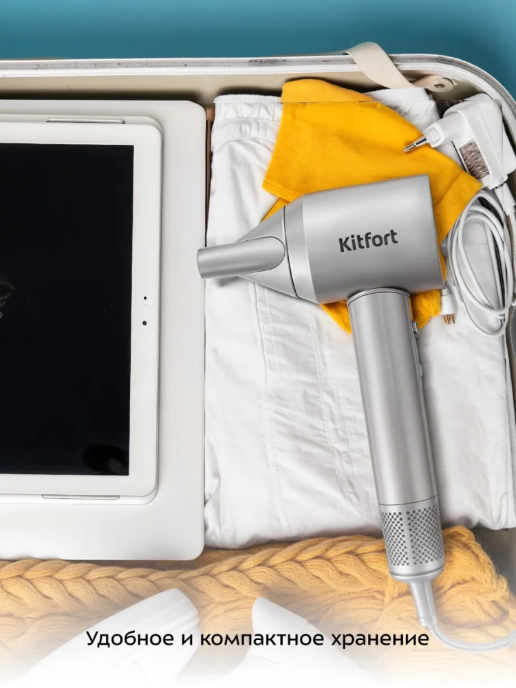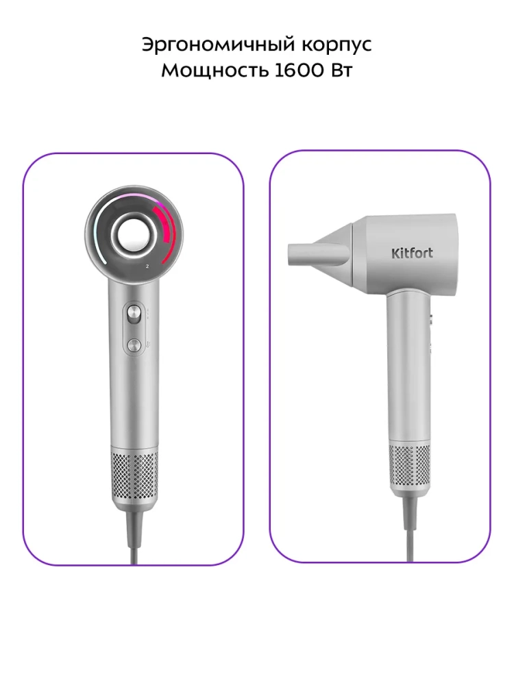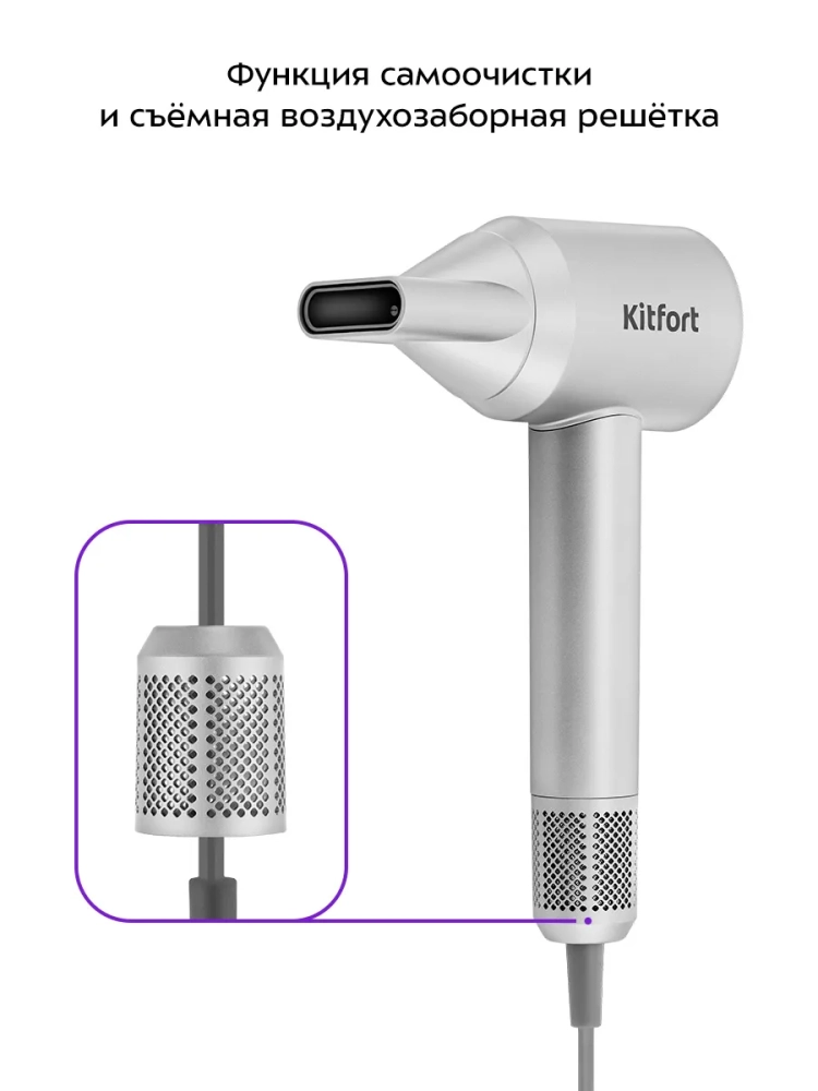 С помощью фена Kitfort КТ-3292 вы можете быстро высушить волосы. Насадка-концентратор из комплекта, которая вращается на 360°, позволяет направить поток воздуха под нужным углом, чтобы сделать укладку без лишних усилий. Благодаря магнитам насадка-концентратор легко закрепляется на устройстве, примагничиваясь к соплу фена.
