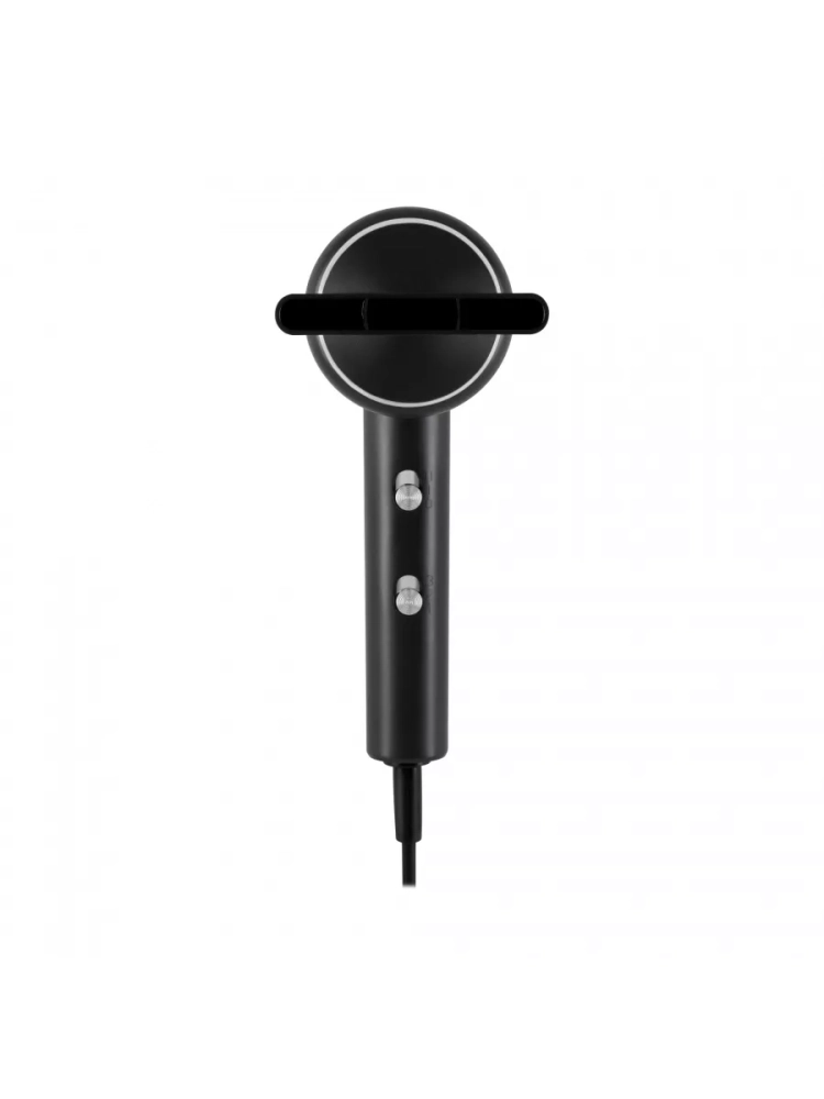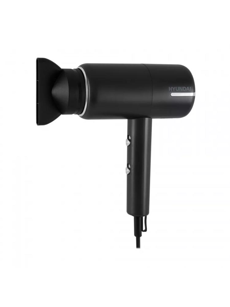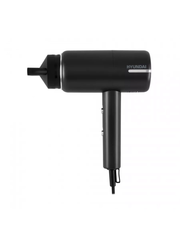 Фен Hyundai H-HDI0777 черный/хром, мощность 1500Вт, насадок 2шт. дорожный формат, петля для подвешивания, шарнирное крепление шнура, ионизация, холодный воздух, концентратор. Шарнирное крепление шнура. Петля для подвешивания.