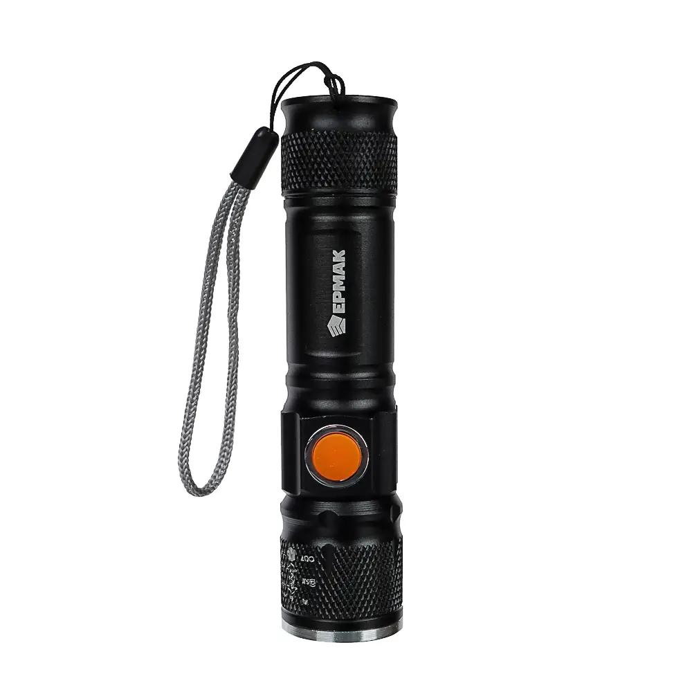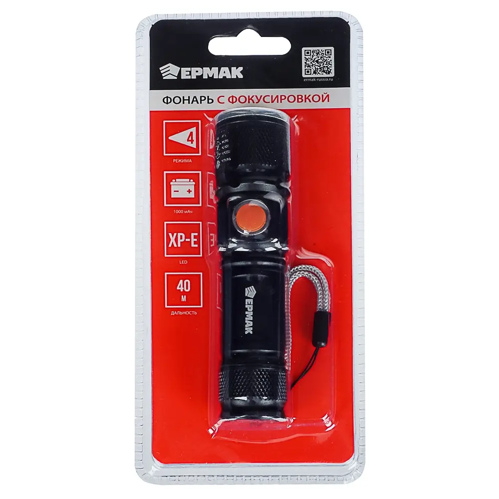 Фонарь ручной тм ЕРМАК, XPE,1000 мАч,10x2x2см,4 режима,пластик,металл, с USB штекером,фокусировка