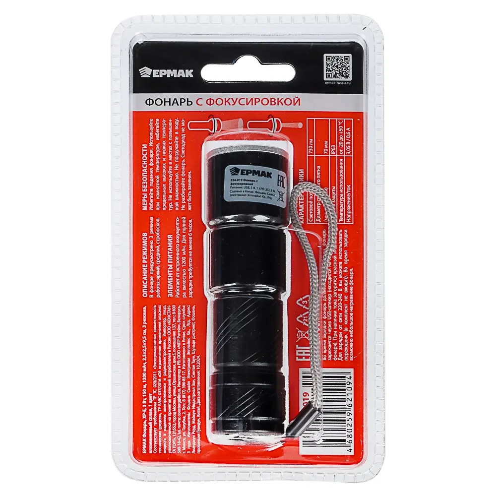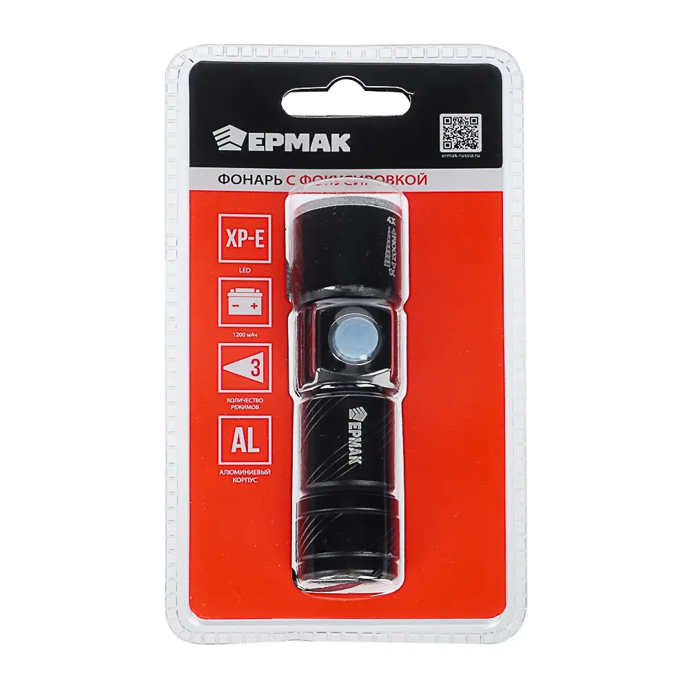 Фонарь ручной тм ЕРМАК,XPE,1200мАч,2,5х2,5х9,5см,3 режима,алюминиевый,с USB штекером,фокусировка