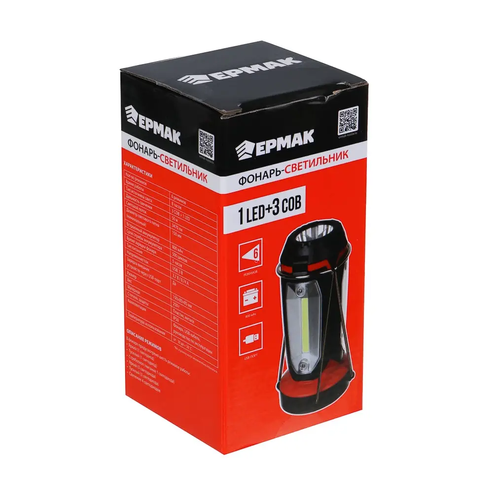 Фонарь светильник тм ЕРМАК, 1 LED, 3 COB, 800мАч, USB, 15х8.5х8.5см, 6 режимов, пластик