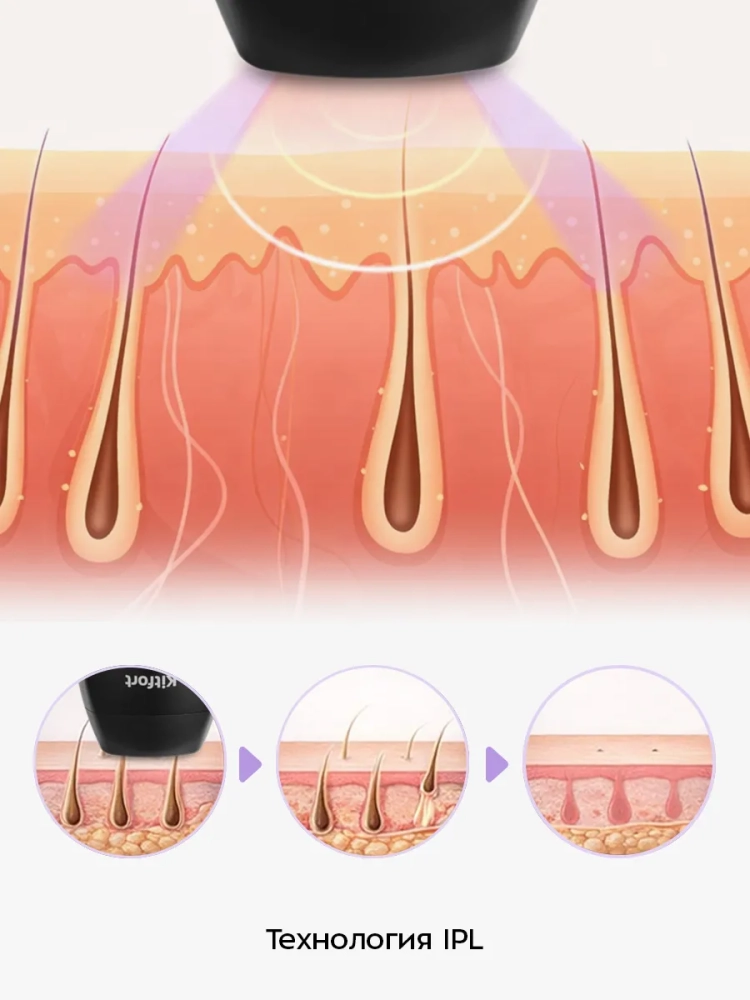 Для профессионального удаления волос в домашних условия в устройстве используется технология интенсивных световых импульсов (Intense Pulsed Light, IPL). Принцип действия основан на воздействии светового импульса на меланин в волосах. Меланин поглощает световой импульс и преобразует его в тепло. Тепло переходит к корню волоса, разогревает и разрушает волосяной фолликул. При использовании технология IPL результат достигается только при удалении темных волос на коже от светлого до смуглого тона. Фотоэпилятор, использующий данную технологию, не подходит для удаления светлых, рыжих и седых волос, а также для использования на очень темной коже.