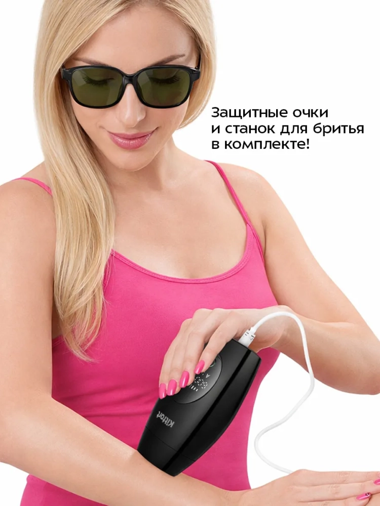 Фотоэпилятор оснащен защитой от случайного включения: устройство не произведет световой импульс, если встроенный в фотоэпилятор сенсор не соприкасается с кожей. Специальные очки защитят ваши глаза от воздействия световых импульсов во время проведения процедуры.