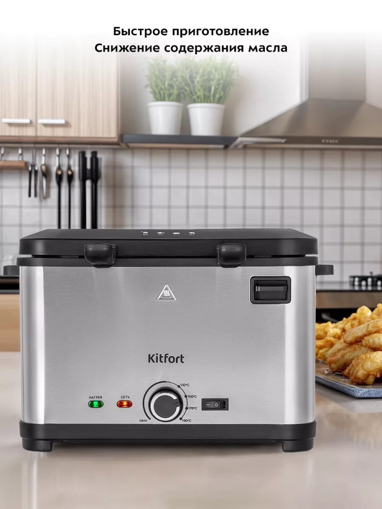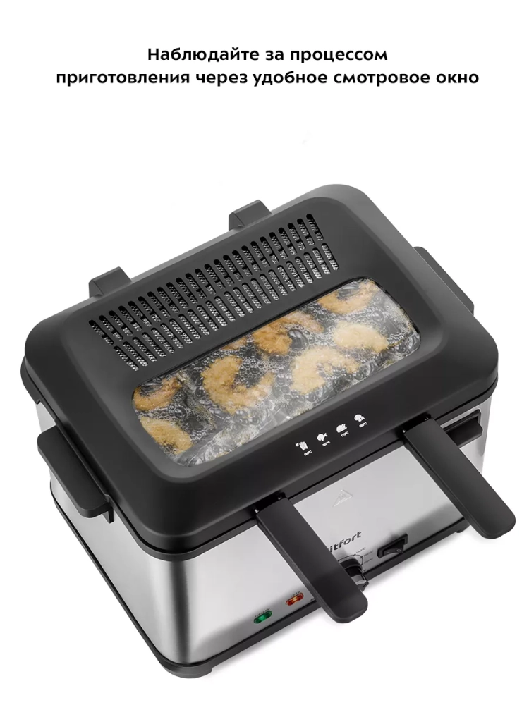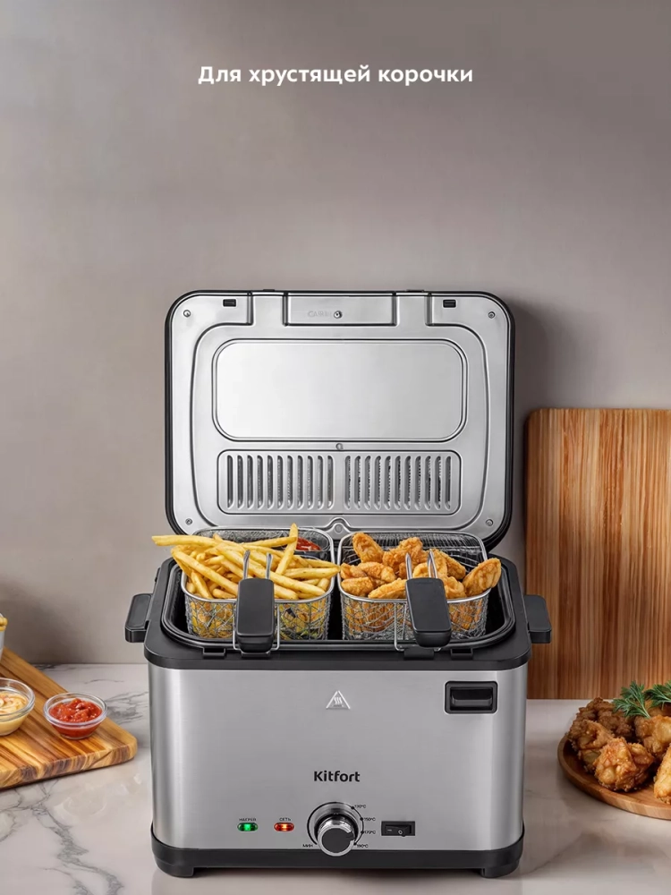 Фритюрница электрическая Kitfort КТ-6240 — это превосходное бытовое устройство для тех, кто ценит вкусную и хрустящую еду. Эта кухонная техника позволяет готовить разнообразные блюда, такие как картофель фри, пончики и куриные крылышки в домашних условиях. Фритюрница оснащена мощностью 2000 Вт, что обеспечивает быстрое нагревание масла и равномерное обжаривание продуктов со всех сторон. Электрический регулятор температуры позволяет точно установить нужный температурный режим приготовления. Индикатор нагрева подскажет момент достижения оптимальной температуры масла. В комплект входят три съемные корзины: одна большая для объемных порций и две малые для небольших закусок или гарниров. Съемный дизайн корзин облегчает их чистку и хранение. Крышка фритюрницы оснащена смотровым окном, через которое можно наблюдать за процессом приготовления без необходимости открывать крышку. Это помогает сохранить тепло внутри прибора и избежать разбрызгивания масла. Также в крышке установлен фильтр, который минимизирует распространение запахов во время жарки. Фритюрница Kitfort КТ-6240 имеет удобные боковые ручки для легкого перемещения по кухне или хранения после использования. Держатели шнура питания на задней части корпуса обеспечивают аккуратное хранение кабеля. Этот мощный электроприбор Китфорт идеально подходит не только для картошки фри или картофеля в кляре, но также справляется с приготовлением овощей, рыбы и мяса во фритюре с минимальным содержанием масла благодаря решетке из нержавеющей стали внутри чаши на несколько литров.