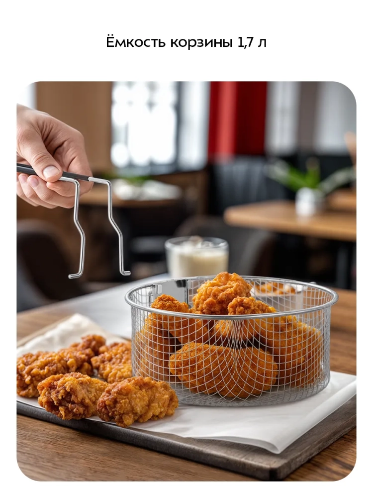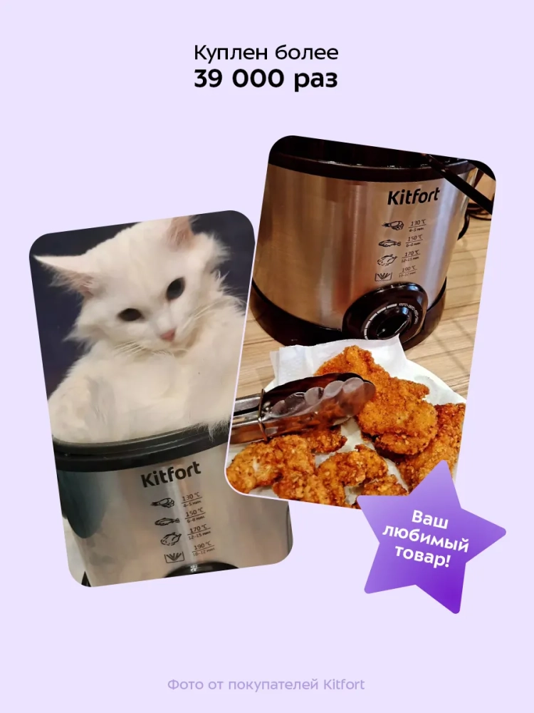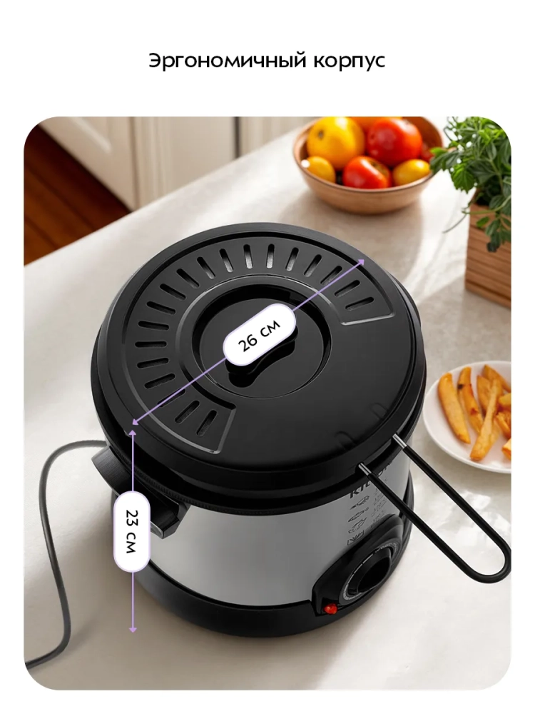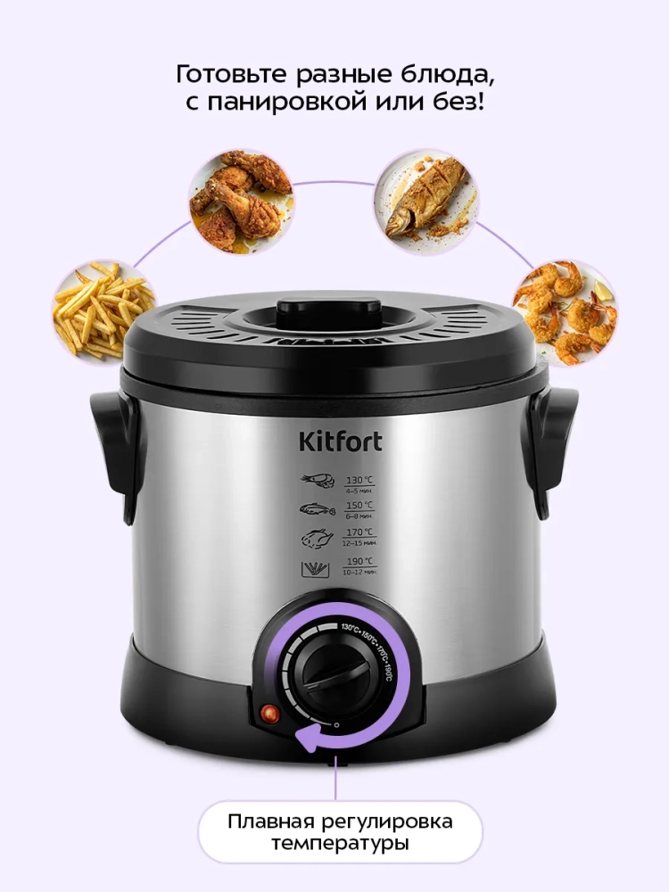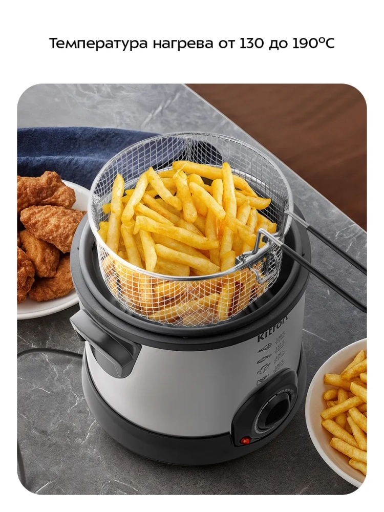 Во фритюрнице Kitfort КТ-2011 продукты жарятся в глубоком слое горячего масла. С помощью термостата вы можете плавно регулировать температуру приготовления. Чаша фритюрницы несъемная, покрыта антипригарным покрытием.