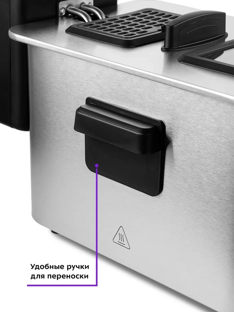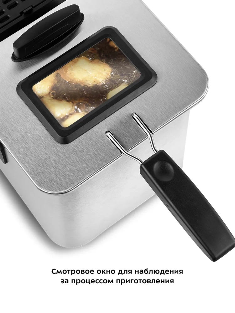 Фритюрница оснащена съемной чашей, что облегчает ее чистку и уход. Корпус, крышка и корзина выполнены из нержавеющей стали, что гарантирует долговечность и надежность техники. Термостойкие ручки из пластика обеспечивают безопасность при использовании. Смотровое окно на крышке позволяет контролировать процесс приготовления, не открывая фритюрницу, что сохраняет температуру и предотвращает разбрызгивание масла.