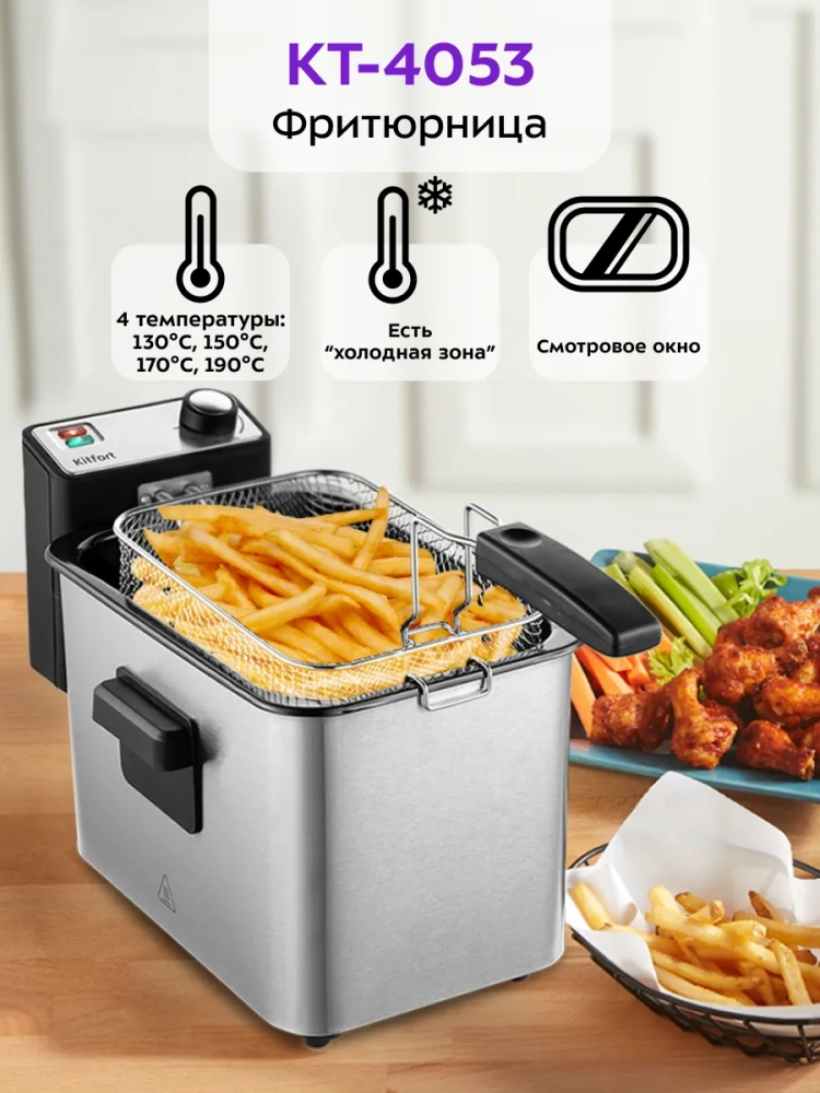 Электрическая фритюрница оснащена регулятором температуры, что позволяет точно настроить режим приготовления для каждого блюда. "Холодная зона" между чашей и нагревателем предотвращает пригорание остатков пищи, что исключает неприятные запахи и привкусы. Для удобства хранения предусмотрена съемная ручка корзины.