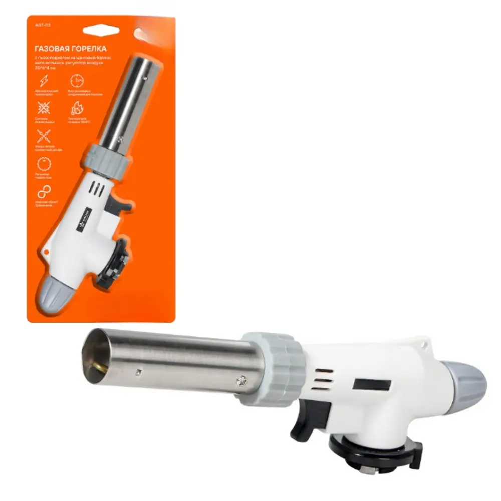 Представляет собой Насадку с соплом на газовый баллон оборудованую пьезоподжигом.В отличии от модели AGT-02 имеет более длинное сопло с увеличеным диаметром, а так же удобное разположение кнопки поджига. Спло данной горелки оборудованна регулятором подачи воздуха для изменения температуры и формы пламени. Применяется для розжига костра, разогрева трубопровода, нагрева предметов и проведения различных ремонтных работ. Горелка-насадка используется совместно со стандартным газовым баллоном цангового типа, который в комплект поставки не входит.