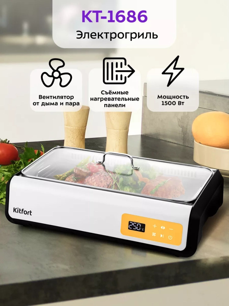 Электрогриль Kitfort КТ-1686 предназначен для приготовления мяса, рыбы, овощей, сосисок, бутербродов, панини, сэндвичей, гренок, тостов и многих других блюд. Высокая температура способствует быстрому приготовлению продуктов.