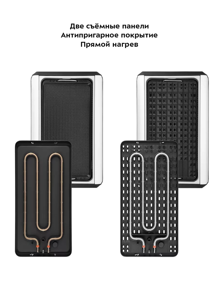 У прибора две панели для жарки: с гладкой и ребристой поверхностью. Панель с ребристой поверхностью позволяет получить характерный «полосатый» рисунок на поверхности продуктов. Нагревательный элемент встроен в сами панели, что обеспечивает быстрый нагрев панелей. Для удобства ухода панели сделаны съемными.