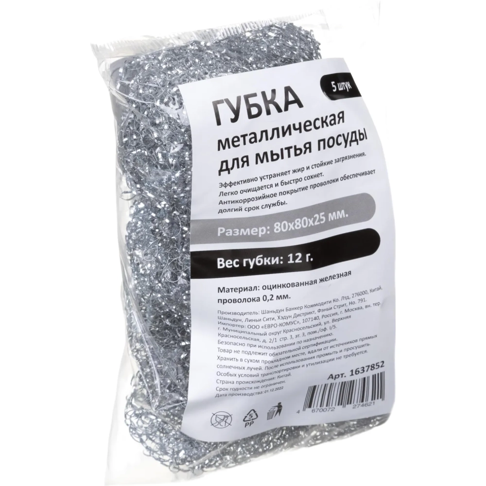 Губка-мочалка металлическая для мытья посуды 80x80x25мм 12г 5шт/уп