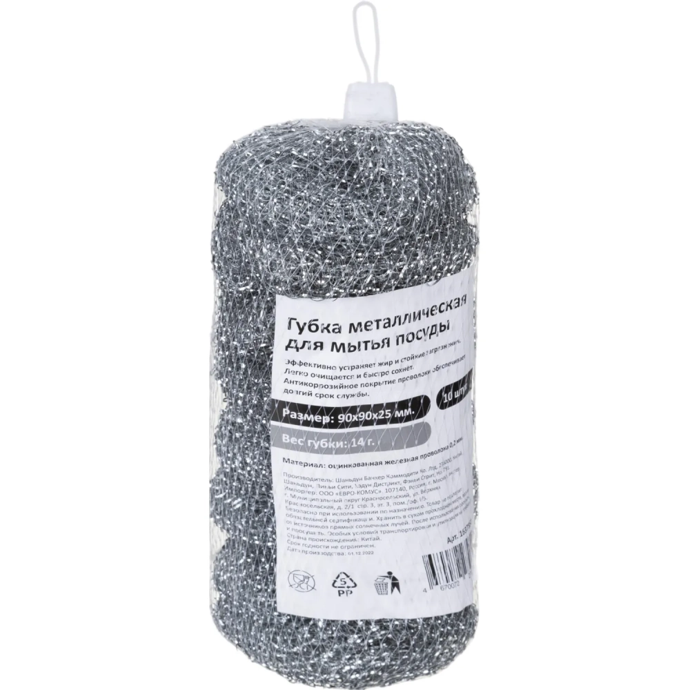 Губка-мочалка металлическая для мытья посуды 90х90x25мм 14г 10шт/уп