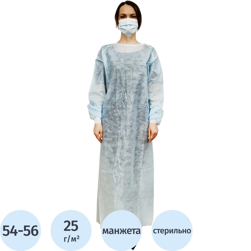 Халат хирург. стер, ЕВРО, рук.манж, дл.140 см, р.54-56, пл.25, смс, 1шт