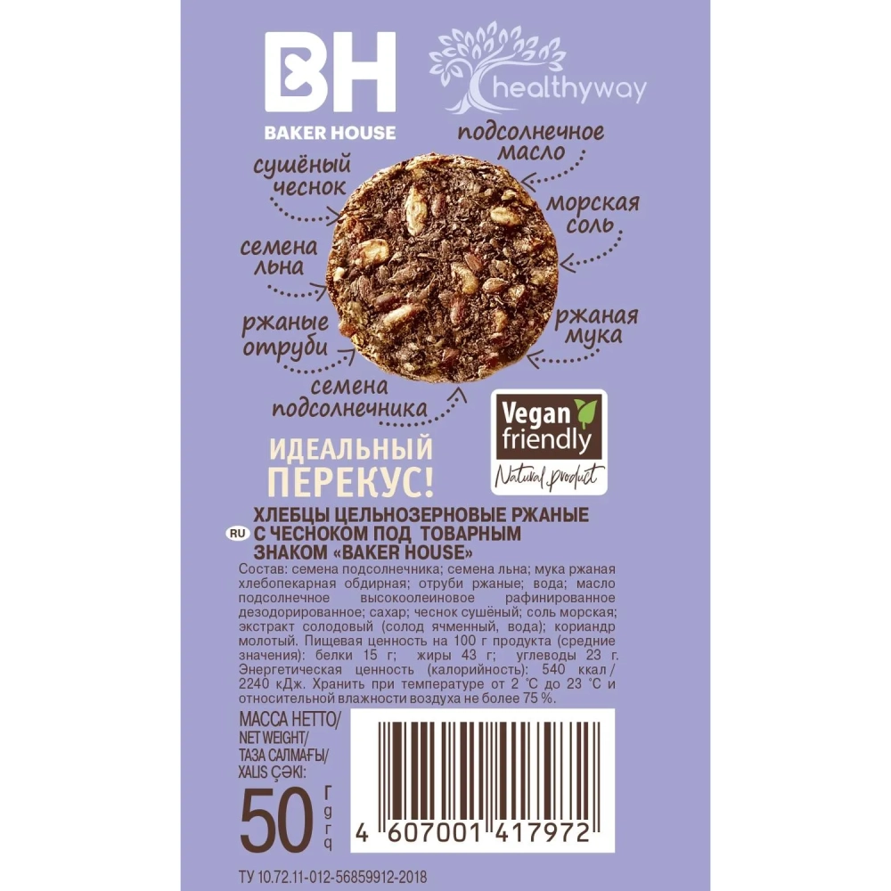 Хлебцы цельнозерновые Baker House ржаные с чесноком, 50г