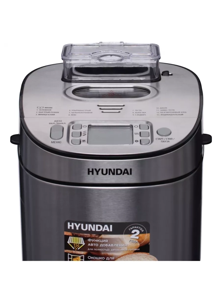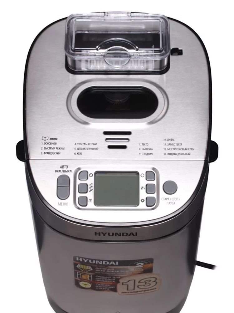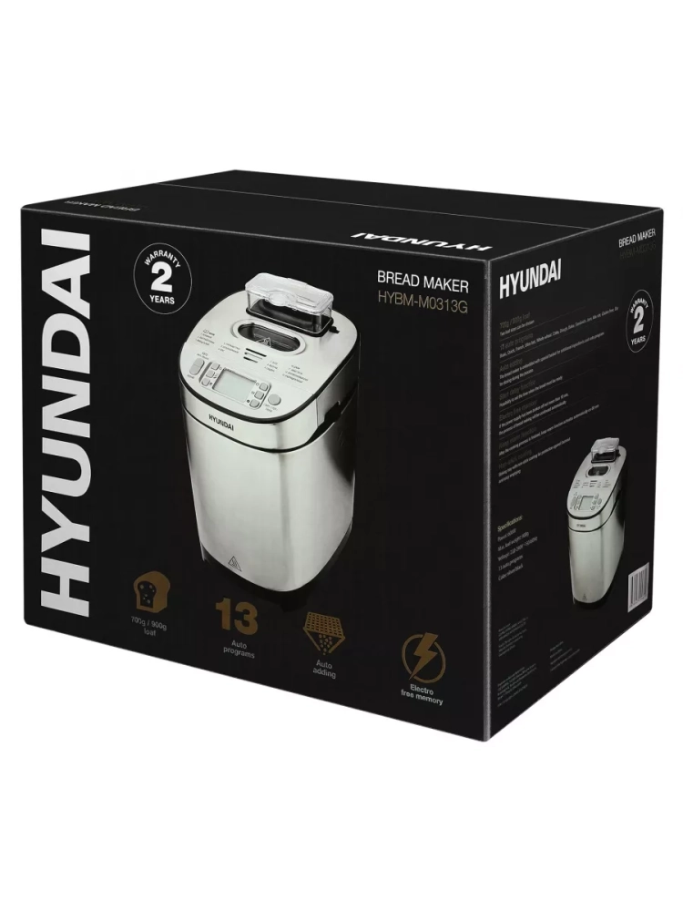 Хлебопечь Hyundai HYBM-M0313G серебристый/черный, мощность 600Вт, вес выпечки до 900г, форма выпечки буханка, программ приготовления: 13. размер корзины для хлеба 13,5х13,5х15,6 см. Книга рецептов, Мерный стакан, мерная ложка, лопасть для замешивания теста, крюк для извлечения лопасти